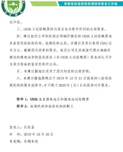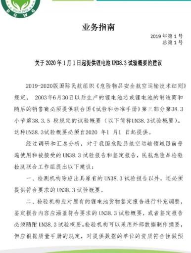 2019-2020版國際民航組織《危險物品安全航空運輸技術(shù)細(xì)則》規(guī)定,2003年6月30日以后生產(chǎn)的鋰電池芯或者鋰電池的制造商和隨后的銷售商必須提供聯(lián)合國《試驗和標(biāo)準(zhǔn)手冊》第三部分第38.3小節(jié)第38.3.5段規(guī)定的試驗概要(以下簡稱UN38.3試驗概要)。